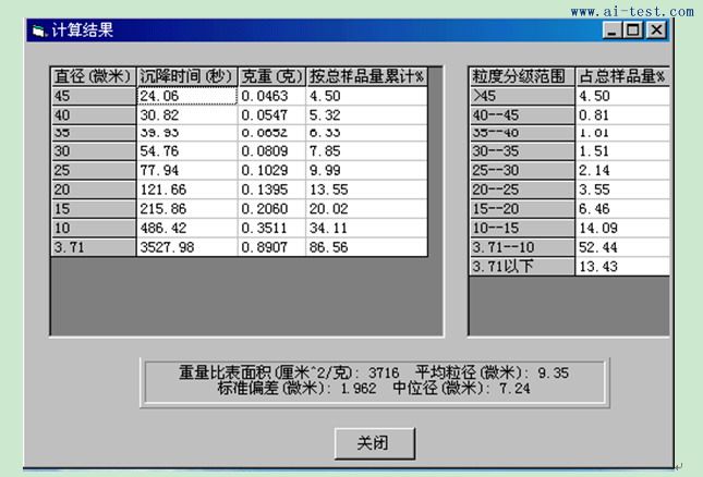 沉降曲線采集、存儲(chǔ)、調(diào)用;顆粒大小、中位徑、平均粒徑、比表面積測(cè)定;平均 誤差計(jì)算;顆粒分布分析;計(jì)算結(jié)果、圖表打印 |